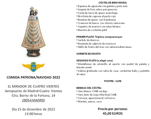 Comida Patrona/Navidad.- Tendrá lugar en el complejo EL MIRADOR DE CUATRO VIENTOS (instalaciones del Real Aeroclub de España) el próximo día 15 de diciembre a las 13:00 horas. Nuestra intención es celebrar previamente una misa por los fallecidos de APAVE en el mismo lugar. La Eucaristía daría comienzo a las 12:00 horas.
